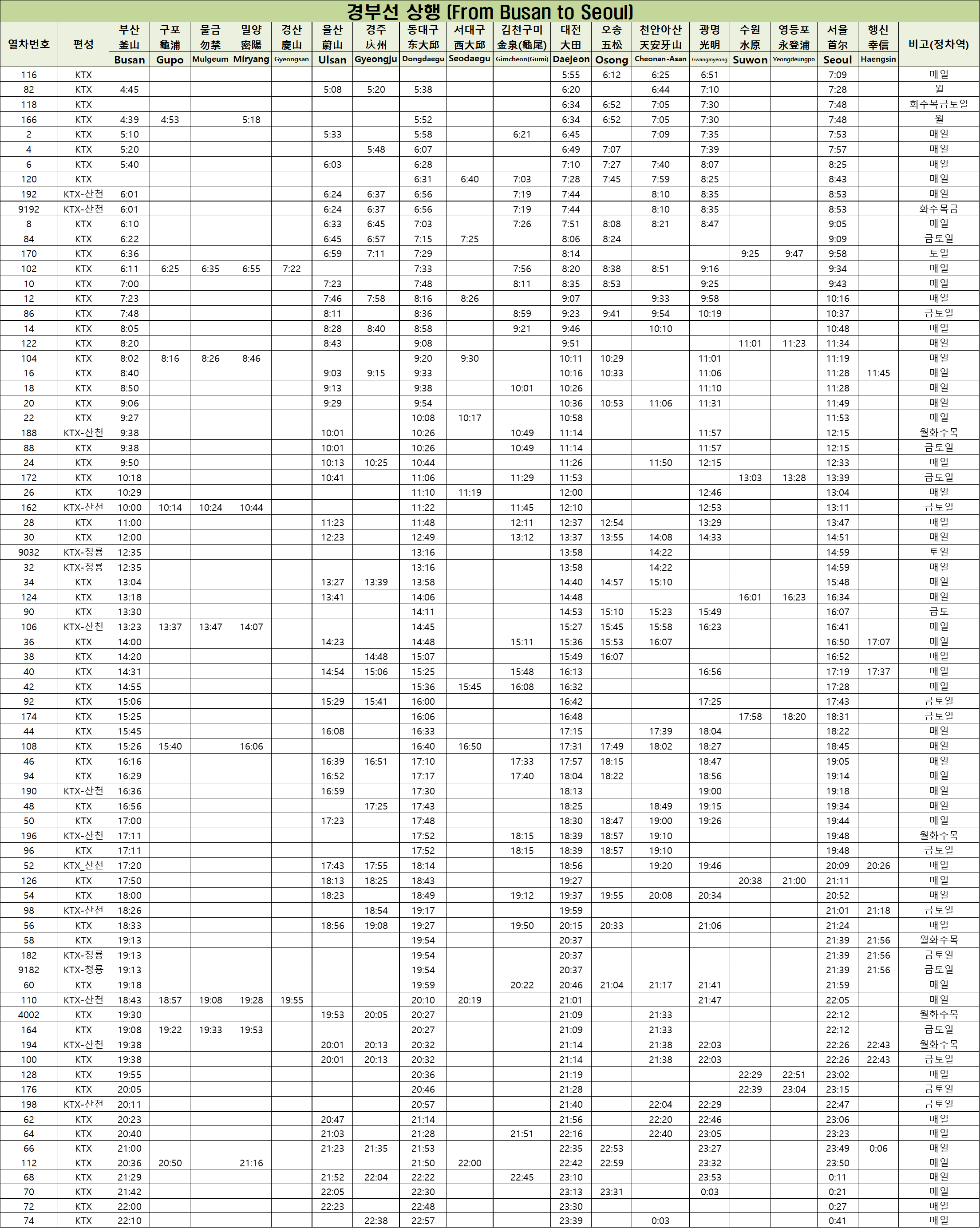 아래는 경부선 KTX의 최신 열차 시간표입니다.