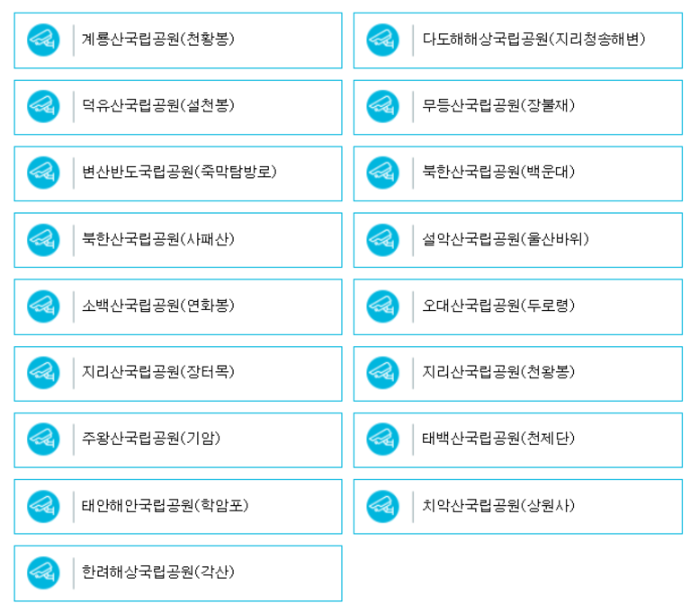 지역별 국립공원 CCTV 링크 각 국립공원별로 개별 CCTV 링크를 제공하며, 해당 지역의 날씨나 환경을 바로 확인할 수 있습니다.