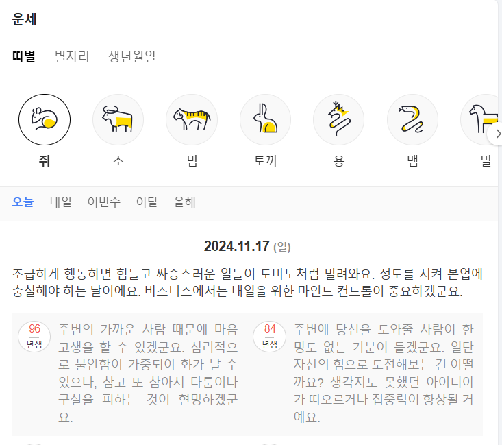 예를 들어, 쥐띠, 소띠, 호랑이띠 등 각 띠별로 오늘의 운세를 제공합니다. 띠별 운세는 대개 하루의 운세를 짧고 간결하게 알려주기 때문에, 빠르게 운세를 확인하고 싶을 때 유용합니다.