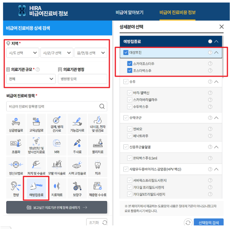 해당 사이트에서는 지역에 따라 그리고 예방접종 할 백신에 따라 가격을 조회해볼 수 있어 유용합니다.