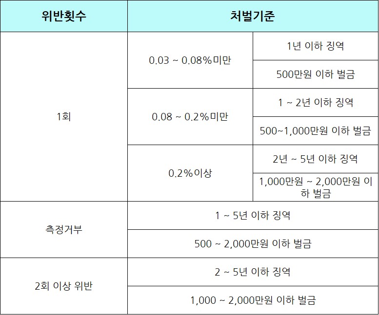 - 혈중알코올농도 0.2% 이상: 가중 처벌 적용, 형량과 2,000만원 이하의 벌금 대폭 증가