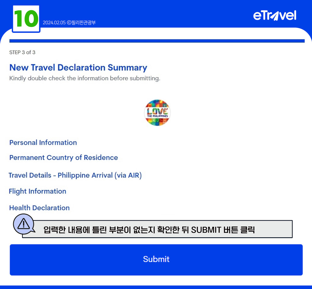 양식을 제출한 후, 확인 이메일을 통해 제출된 내용을 다시 확인할 수 있습니다. 필리핀 도착 시 해당 양식을 제출했다는 증명을 준비해두어야 합니다.