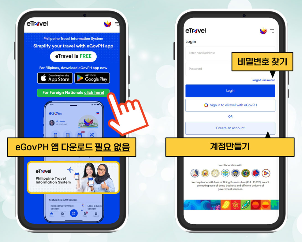필리핀 이트래블 계정 생성 방법은 간단합니다. 먼저 etravel.gov.ph/authentication 페이지에 접속해 이메일을 등록한 후, 이메일로 받은 OTP 보안코드를 입력하고 비밀번호를 설정합니다. 비밀번호는 최소 8자 이상이어야 하며 대문자와 소문자가 포함되어야 합니다.